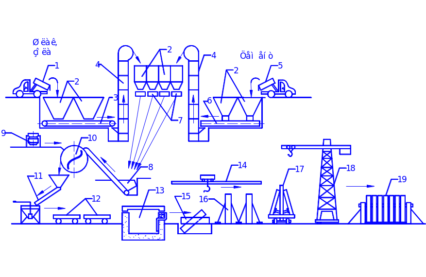 1.Пневмоподача компонентов. 2.Приемные бункеры. 3. Весовые дозаторы. 4.Скиповый подъемник. 5.Дозатор. 6.Растворомешалка. 7.Передвижная газобетономешалка. 8.Формы-вагонетки. 9.Автоклав. 10.Кантователь. 11.Посты отделки изделий. 12.Склад готовой продукции. 13.Изделия. 14.Накопительный бункер.