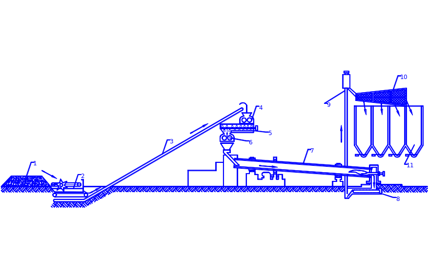 5. Двовальний змішувач. 6.Дірчаті вальці. 7.Піч, що обертається. 8.Холодильник. 9.Пневмотранспорт. 10.Вібросіто. 11.Сілосний склад готової продукции