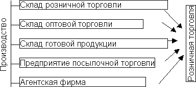 Каналы распределения имеют различное строение. В логистической системе с прямыми связями каналами распределения не содержат каких-либо оптово-посреднических фирм. В гибких и эшелонированных системах такие каналы имеются.