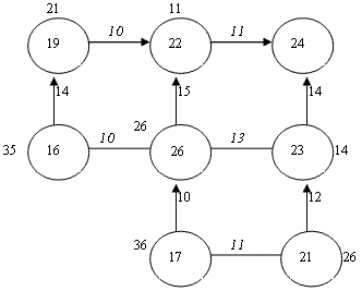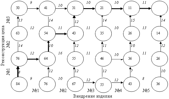 На рисунке 2.2.27 приведены исходные данные задачи, где в кружках обозначены номера состояния системы, между кружками – курсивом затраты на переходы системы из одного состояния в другое. В частности, – над горизонтальными линиями – затраты на внедрение нового изделия, а справа от вертикальных линий – затраты на реконструкцию соответствующего цеха в условных денежных единицах (у.д.е).