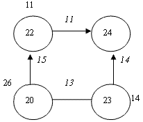 На следующем шаге – переход системы из состояния 20 в конечное состояние, возникает два альтернативных варианта: или переход по пути 20-22-24 или по пути 20-23-24. Иначе говоря, реконструкция может завершаться или реконструкцией третьего цеха, а затем – внедрением пятого изделия, или наоборот,- сначала внедрением этого изделия, а затем реконструкцией цеха. В первом случае для этого понадобится 11+15=26 у.д.е, а во втором 14+13=27. Очевидно, что первый вариант выгоднее, поэтому стрелку ставим вверх и над кружком 20 ставим минимальное число 26 так как это показано на рисунке 2.2.29. Такое решение называется условно оптимальным.