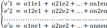 Матрица S, столбцами которой являются координатные столбцы векторов базиса E′ = (e′1, e′2, . . . , e′n) в базисе E = (e1, e2, . . . , en), называется матрицей перехода от базиса E к базису E′.