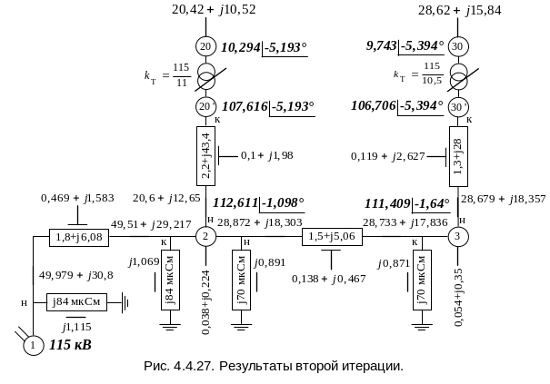 Для анализа результатов расчета параметров установившегося режима, полученных при выполнении первой итерации, все параметры нанесены на схему замещения сети и приведены на рисунке 4.27.
