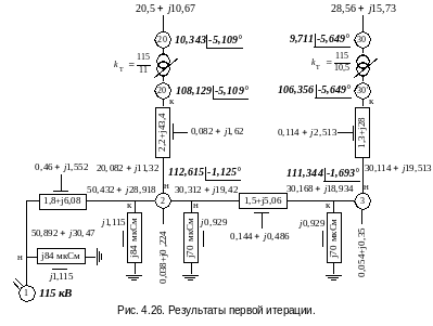 Для анализа результатов расчета параметров установившегося режима, полученных при выполнении первой итерации, все параметры нанесены на схему замещения сети и приведены на рисунке 4.26.