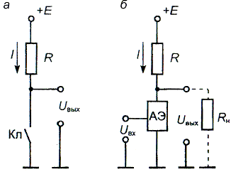 Пример упрощенной ключевой схемы показан на рис. 3.2, а. Для ключа характерны два устойчивых состояния: «включено» и «выключено». В состоянии «включено» (ключ замкнут) через ключ течет ток 1, и напряжение на выходе равно нулю, в состоянии «выключено» (ключ разомкнут) ток через ключ не протекает и напряжение на выходе равно Е. В современных ИС роль ключа выполняет активный элемент (АЭ) – биполярный или полевой транзистор (рис. 3.2, б), к выходу которого подключается внешняя нагрузка RH. Под воздействием управляющего сигнала транзистор запирается или отпирается, что соответствует размыканию или размыканию ключа. В открытом состоянии транзистор обладает некоторым небольшим внутренним сопротивлением Ri и на выходе устанавливается низкое напряжение U0 = E Ri / (R + Ri). В закрытом состоянии устанавливается высокое напряжение U1 = Е RН/ (R + RH).