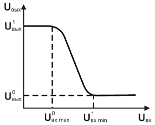 - средняя потребляемая мощность Pпот.ср.;Статические параметры потому и называются статическими, что определяются с помощью статических характеристик, которые снимаются при медленных изменениях токов и напряжений. Это обстоятельство позволяет пренебрегать переходными процессами. Влияние переходных процессов, имеющихся в любой реальной микросхеме учитывается при помощи динамических характеристик, которые мы рассмотрим позже. На следующем рисунке показан пример передаточной характеристики инвертирующих элементов (например, "И-НЕ", "ИЛИ-НЕ").