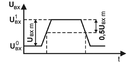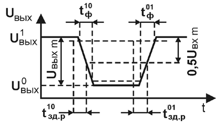 - время задержки сигнала при включении t01зд.р - интервал времени между входным и выходным импульсами при переходе Uвх микросхемы от U1вых до U0вых, измеренный либо на уровне 0,5 амплитуды импульса, либо на уровне порога чувствительности;