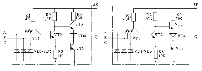На рис. 2.3, а показан базовый логический элемент серии К131 (зарубежный аналог - 74Н). Базовый элемент серии К155 (зарубежный аналог - 74) показан на рис. 2.3, б, а на рис. 2.3, в - элемент серии К134 (зарубежный аналог - 74L). Сейчас эти серии практически не развиваются.