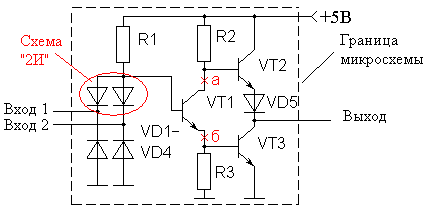 При необходимости объединения нескольких логических элементов "И" по схеме "ИЛИ" (или при реализации логических элементов "ИЛИ") транзисторы VT2 соединяются параллельно в точках "а" и "б", показанных на рисунке 8, а выходной каскад используется один. В результате быстродействие такого, достаточно сложного элемента, получается точно таким же, как и у одиночного логического элемента "2И-НЕ". Принципиальная схема логического элемента "2И-2ИЛИ-НЕ" приведена на рисунке 4.