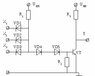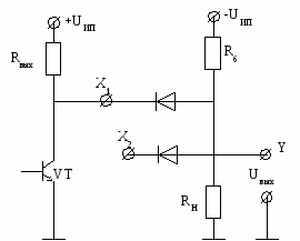 К сожалению приведенные схемы логических элементов не могут каскадироваться, так как мощность сигнала при распространении по схеме уменьшается. Поэтому к схеме диодного логического элемента "И" обычно подключается двухтактный усилитель на биполярных транзисторах. Схема такого логического элемента приведена на рисунке 3.