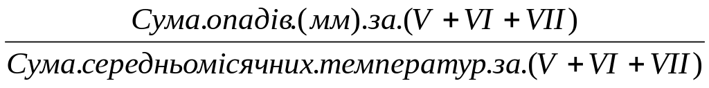 Коефіцієнт зволоження або водного балансу; його потрібно визначити за формулою Г.Т.Селянинова (1937):