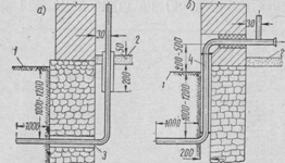 Рис. 3. Устройство вводов газопроводов в здание а — через фундамент; б — через цоколь в штрабе; 1 — уровень земли; 1 — уровень пола; 3 — футляр; 4 — футляр без набивки