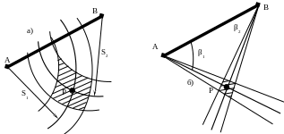 Положение точки на плоскости по двум измерениям получается в пересечении двух линий положения. Для измеренного расстояния линией положения является окружность радиуса с центром в исходном пункте (рис.36-а); для измеренного угла с вершиной в исходном пункте - прямая линия, проведенная под углом к исходной линии (рис.36-б).