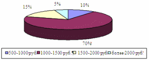 Из рисунка видно, что 70% (56) согласны потратить на экскурсию от 1000 до 1500 руб., 15% (12) - от 1500 руб. до 2000 руб., 10% (8) - от 500 до 1000 руб., и 5% (4) - более 2000 руб.