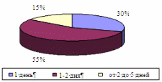 Рисунок показывает, что основная масса респондентов - 55% (44) заинтересованы в продолжительности экскурсии 1-2 дня, почти четверть - 30% (24) 1 день, и оставшиеся 15% (12) от 2 до 5 дней.