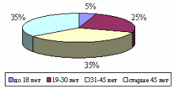 Из рисунка видно, что основная часть опрошенных - 35% (28) относятся к возрастным категориям 31-45 лет и старше 46 лет, 25% (20) - 19-30 лет и 5% (4) - респонденты до 18 лет.