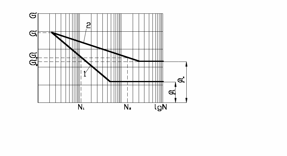 На рис. 2.1. приведены кривые усталости деталей до обработки ППД (кривая 1) и после обработки ППД (кривая 2). Видим, что предел выносливости деталей, обработанных ППД, существенно выше, чем у необработанных ППД: