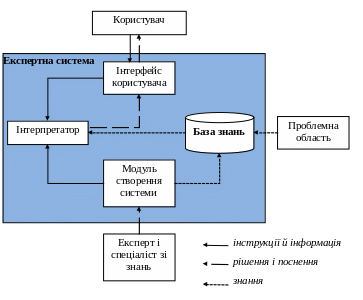 Основними компонентами інформаційної технології, використовуваної в експертній системі, є (рис. 8.1): інтерфейс користувача, база знань, інтерпретатор, модуль створення системи [2,4].