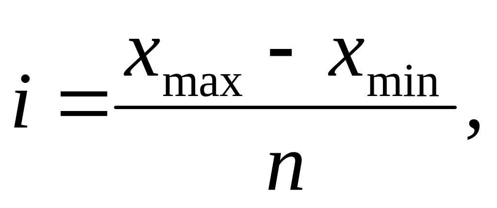 где xmax , xmin - максимальное и минимальное значения варьируемого группировочного признака; i - величина интервала. Количество групп и величина интервала связаны между собой: чем больше образовано групп, тем меньше интервал, и наоборот. Это следует из последней формулы с учётом того, что размах колеблемости xmax - xmin является определенным для изучаемой совокупности.