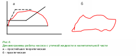 Характерной особенностью динамограмм рассматриваемого типа является нарушение параллельности линий восприятия нагрузки штангами и разгрузки штанг. Наклон линии восприятия увеличивается, а наклон линии разгрузки уменьшается, и сама линия закругляется в части, соответствующей концу хода плунжера вверх. Имеются и другие признаки, хорошо видные на рис.6а. На рис.6б приводится в качестве примера практическая динамограмма утечки жидкости в нагнетательной части насоса.