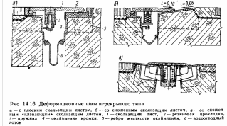 В перекритих швах горизонтальне переміщення торців прогонових споруд забезпечується зміною положення елементу, перекриваюшего зазор, відносно осі шва. Деформаційні шви перекритого типу використовуються при переміщеннях до 400мм. Розрізняють наступні їх різновиди: з плоским «скользящим» листом (рис.14.16, а) , зі скошеним «скользящим» листом (рис. 14.16, б) , зі скошеним «плаваючим» «скользящим» листом (рис. 14.16, в) , з консольною гребінчастою плитою (рис 14.17, б).