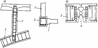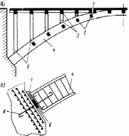 Конструкцию проезжей части в мостах с отдельными арками рекомендуется отделять от арок швами, чтобы предотвратить появление дополнительных напряжений в ней и надарочных стойках от совместной работы с арками. Значительные дополнительные напряжения могут возникнуть в коротких стойках, ближайших к замку. На концах этих стоек часто устраивают шарниры, превращая их в так называемые качающиеся стойки (см. рис.11, а), не воспринимающие изгибающих моментов благодаря шарнирам.