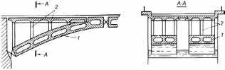 Разновидность арочных мостов со сводами своеобразной облегченной конструкции представляют собой мосты из арочных дисков (рис.10).В арочных дисках плиту проезжей части объединяют для совместной работы с нижней криволинейной плитой и продольными стенками как единое коробчатое сечение.