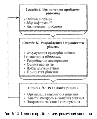 Процес прийняття рішень в інноваційному менеджменті являє собою циклічний процес, у якому вихідна інформація про стан інноваційної діяльності в організації трансформується в напрямі впливу на об'єкт управління з метою приведення його в бажаний стан. Процес прийняття рішення складається з певних стадій і фаз, як це показано на рис. 6.10.