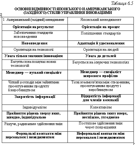 У табл. 6.5 наведені основні риси японського й американського стилів управління інноваціями.