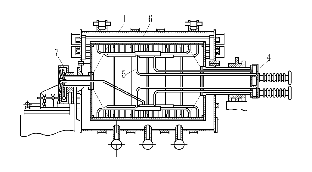 1 - барабан; 2 - нижнее полукорыто; 3 - крышка; 4 - распределительная головка; 5 - система распределительных труб; 6 - устройство для промывки осадка; 7 - привод барабана.