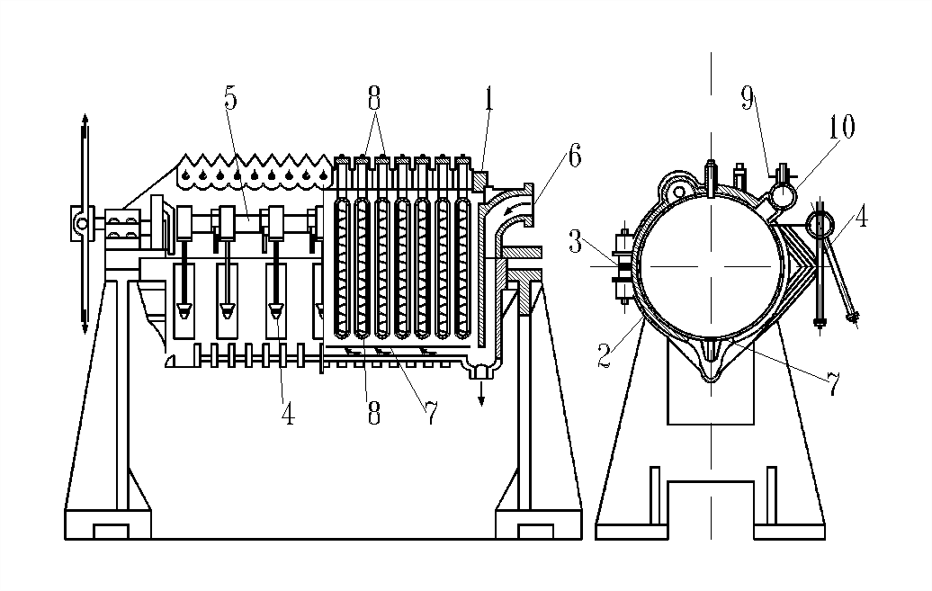 На рисунке 39 показан распространенный листовой горизонтальный фильтр-пресс с круглыми элементами. Эти фильтр-прессы применяют в процессах очистки масел. Цилиндрический корпус состоит из двух частей 1 и 2. Нижняя половина закреплена на оси 3 и прижимается к верхней откидными болтами 4. Герметичное прижатие осуществляет эксцентриковый вал 5, поворотом которого одновременно подтягивают все откидные болты. Вал приводится во вращение через цилиндрическую передачу. Для подъема и опускания нижней половины корпуса предусмотрено специальное гидравлическое устройство.