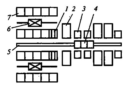 Схема ГПЯ с раздельной транспортно-накопительной системой с двумя складами- накопителями 7 и двумя кранами-штабелерами 6 показана на рис. 6.12.