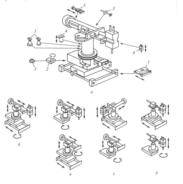 Рис. 7.4. Схемы системы модулей (а) и компоновок с пятью (б), четырьмя (в), тремя (г) и двумя (д) степенями подвижности роботов типа ПР5-2: