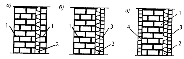 В зависимости от условий работы для обеспечения устойчивости и повышения несущей способности отдельных элементов (столбы, стенки и простенки) их усиливают металлической арматурой. В кладке арматуру размещают в горизонтальных швах. Под влиянием сил трения и сцепления арматура работает как одно целое с выложенной и набравшей прочность кладкой. Наружные стены выполняют в виде трех основных конструктивных схем: массив или сплошная кладка на всю толщину стены (рис. 18.1, а); кладка с утеплителем в теле стены (рис. 18.1, б) и кладка с утеплителем на поверхности стены (рис. 18.1, в).