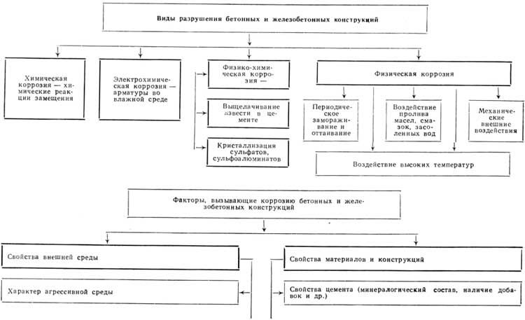 Химическая коррозия бетона. Коррозия данного вида развивается в бетоне при действии на него агрессивной среды — кислот, солей и щелочей, вступающих в обменные реакции с составляющими цементного камня, в результате чего образуются хорошо растворимые соли. Разрушение конструкций кислотами и кислыми газами наиболее часто происходит на заводах, в хранилищах кислот, в лабораториях и т. п.