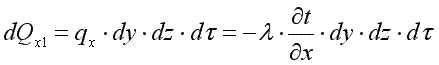 Выделим в теле элементарный параллелепипед с ребрами dx, dy, dz (рис. 9.1). Количество теплоты, которое проходит путем теплопроводности внутрь выделенного объема в направлении оси ОX через элементарную площадку dy·dz за время dτ: