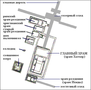 Этот двор замыкался поставленным на высоком искусственном основании Большим храмом, который доминировал над всем ансамблем. Рядом с главным двором помещался Малый храм, а несколько поодаль, вне общей композиции - Круглый храм. |