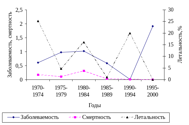 Рис. 4. Интенсивные показатели проявления эпизоотического процесса при лептоспирозе крупного рогатого скота в Республике Хакасия в 1970-2000 гг.