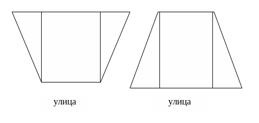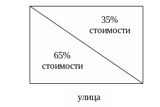 Это правило показывает, что стоимость земельного участка треугольной формы с основой по фронту улицы будет составлять приблизительно 65% от стоимости земельного участка прямоугольной формы Соответственно, стоимость земельного участка треугольной формы, когда на главную улицу (магистраль) выходит его верхушка составляет 35% от стоимости участка прямоугольной формы. Руководствуясь этим правилом, довольно легко учесть отличия в стоимости земельного участка, когда он имеет форму трапеции (рис. 2).