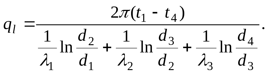 Пусть цилиндрическая стенка состоит из трех разнородных слоев. Диаметры и коэффициенты теплопроводности отдельных слоев известны, их обозначения см. на рис.3.5. Кроме того, известны температуры внутренней и внешней поверхностей многослойной стенки t1 и t4.