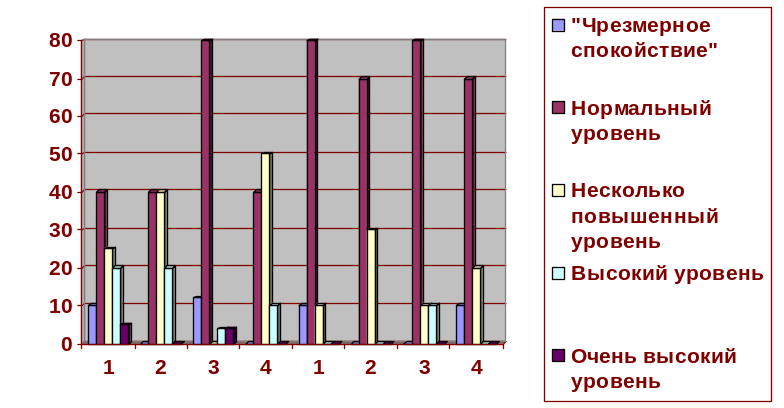 Динамика изменения видов тревожности представлена ниже графически, где: на оси “x” - 1 – Общая тревожность, 2 – Школьная тревожность, 3 – Самооценочная тревожность, 4 – Межличностная тревожность; На оси “y” изображена шкала процентных показателей того или иного вида тревожности. Первые четыре показателя – результат констатирующего эксперимента, последующие четыре – результат контрольного эксперимента.