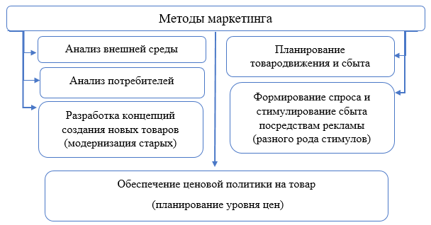 Из вышесказанного следует вывод, что производство продукции (её количество, ассортимент и т.д.) зависят от рынка потребителей, а изучением рынка потенциальных покупателей занимается маркетинг, отсюда вытекают методы маркетинга (см. рис. 2)