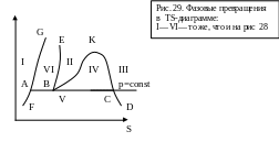 Для воды значения критических параметров следующие: Рк = = 221,29·105 Па, TК =647,3 К, VμК=0,05768 м3/кмоль. На рис. 29 приведена фазовая диаграмма, построенная в Т—s-координатах. Здесь пограничные кривые и области, соответствующие равновесному состоянию различных фаз, обозначены теми же буквами и цифрами, что и в р—vμ -координатах (см. рис. 28).
