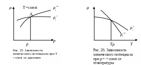 Предположим, что система состоит из двух фаз, давление которых одинаково. Тогда химические потенциалы обеих фаз являются функциями температуры μi' = f (Т) и μi" = f (Т), и в системе координат μiT эти зависимости согласно соотношению μi = (dG/dT)p = —S характеризуются двумя кривыми (рис. 26) с отрицательным угловым коэффициентом. Точка пересечения этих кривых соответствует условиям фазового равновесия системы. Температура Тμ, соответствующая данному давлению, является общей для обеих фаз. При температурах, больших температуры Тμ, наиболее устойчивой является вторая фаза с меньшим химическим потенциалом и, наоборот, при температурах, меньших Тμ, наиболее устойчивой является первая фаза.