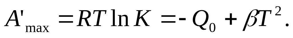 Если принять, что теплоемкость зависит от температуры по линейному закону, то уравнения зависимости энергии Гиббса и энергии Гельмгольца от температуры будет иметь вид при V = const ΔF = -RT ln Kc = QVo — βT2; при р = const ΔG = — RT ln и Kp = QPo — βT2. Так как для кон- дейсйрованных систем различие между A'maxp и A'maxv невелико То в общем виде