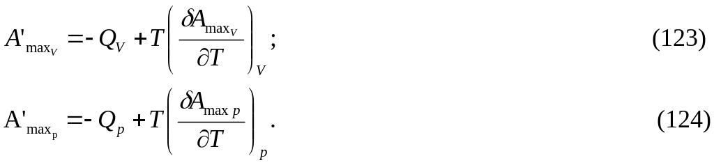 Уравнения (121), (122), связывающие энергию Гельмгольца и энергию Гиббса с их производными по температуре для процессов при V и Т = const и р и Т = const, называются уравнениями Гиббса—Гельмгольца.