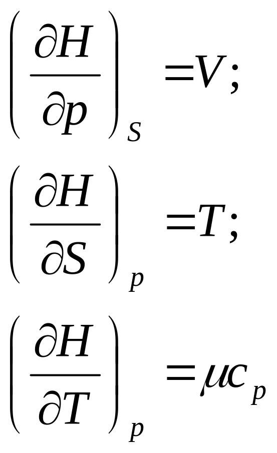 Аналогичным образом можно выразить согласно (88), (95), и (102) полные дифференциалы других термодинамических потенциалов, представляющих собой функции двух определенных независимых переменных и числа киломолей веществ, входящих в систему.