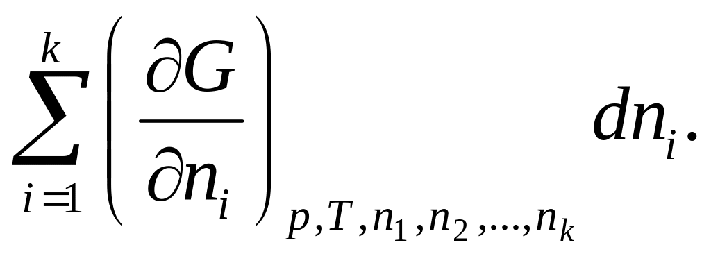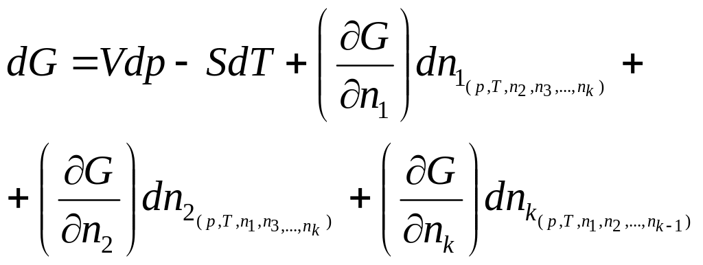 Термодинамические потенциалы каждой части такой системыf могут быть представлены как функции двух переменных и числа киломолей всех веществ, входящих в систему. Например, энергия U =f (S, V, nl, n2, ..., nk) или G = f (p, Т, n1, n2, ..., nk). Предположим, что при изменении числа киломолей какого-нибудь вещества на dn1 значение энергии Гиббса изменится на беско-