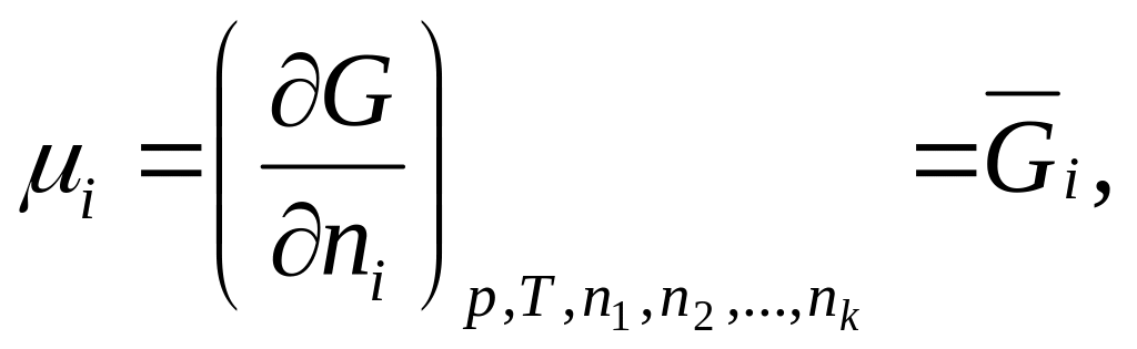 Химическим потенциалом каждого компонента называется частная производная энергии Гиббса по изменению числа киломолей, этого компонента (nt) при неизменном числе киломолей всех остальных компонентов и при ,р и Т = const.