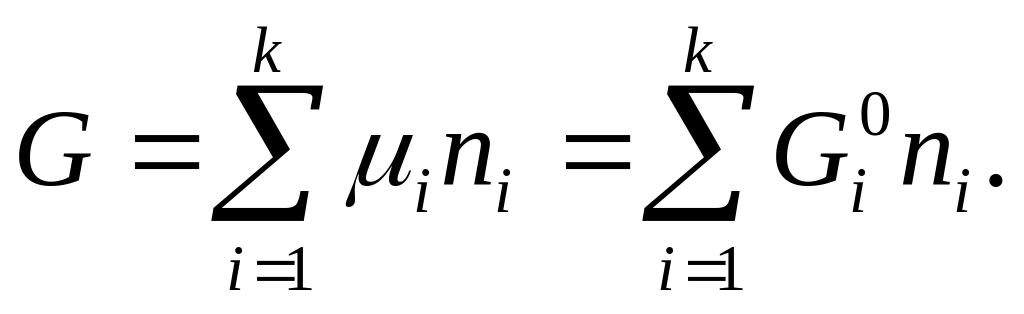 Для идеального газа или для смеси идеальных газов принимается, что химические потенциалы компонентов не зависят от их содержания в системе и для каждого компонента смеси идеальных газов, находящихся при р — const и Т = const, химический потенциал равен значению энергии Гиббса, приходящейся на 1 кмоль компонента, взятого в стандартном состоянии, т. е.